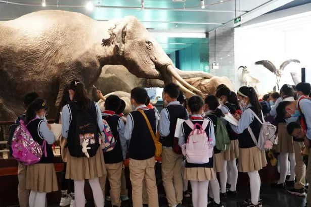 巨大的亚洲象标本吸引了同学们的目光