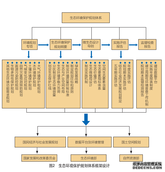 一是构建生态环境保护规划方法体系。依据国家新型空间规划体系, 适应发展新形势和环境保护的新要求, 建设国家空间载体上的生态环境保护规划体系, 对应国家空间高效管理。体现落实国家政策和战略部署, 确定国家重大生态环境保护任务与工程, 强化国家发展规划中的生态保护目标。统筹发展国土空间, 强化空间用途管制、完善布局结构、推进统一规划中生态环境保护规划工作的前置, 发挥积极的约束作用。
