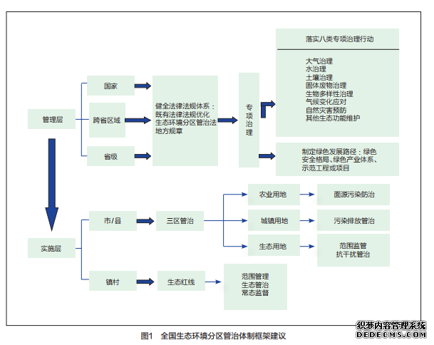 第一,严格控制各类生态功能载体。按管理层和实施层两个层级落位,在国家、跨省区域和省级层面重点健全法律法规体系,包括优化传统环保法律体系、制定生态环境分区管治法、制定地方规章;在此基础上推进专项治理,包含八类专项治理行动和制定绿色发展路径。在市县层面对国土空间提出的三区实施生态环境管治,管治重点因区而异,结合智能化、数字化、可视化监控进行管理。通过三区治理工作,实现生态空间以生态优先为前提,限制开发项目审批;农业空间以最大限制控制面源污染,限制农药和化肥类别,土壤严重污染地区实行休耕和生态安全修复;城镇空间发挥生态调节效能,加强污染排放管理,提高和保障生态功能空间强度和密度。在镇村层面重点开展生态红线管治工作,落实精准
