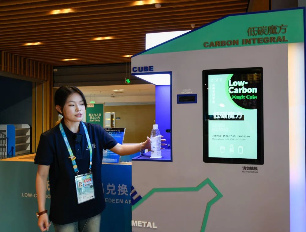记者看到,许多场馆里设置了互动式的“低碳魔方”。“低碳魔方”有一人多高,像一个有一张“大嘴”的柜子。赛事期间,观赛市民将矿泉水瓶、易拉罐、纸杯等可回收废弃物放进“低碳魔方”的“大嘴”里,它就会自动对物品进行扫描,打印出碳积分小票。市民凭小票可以兑换相应的大运会纪念品。